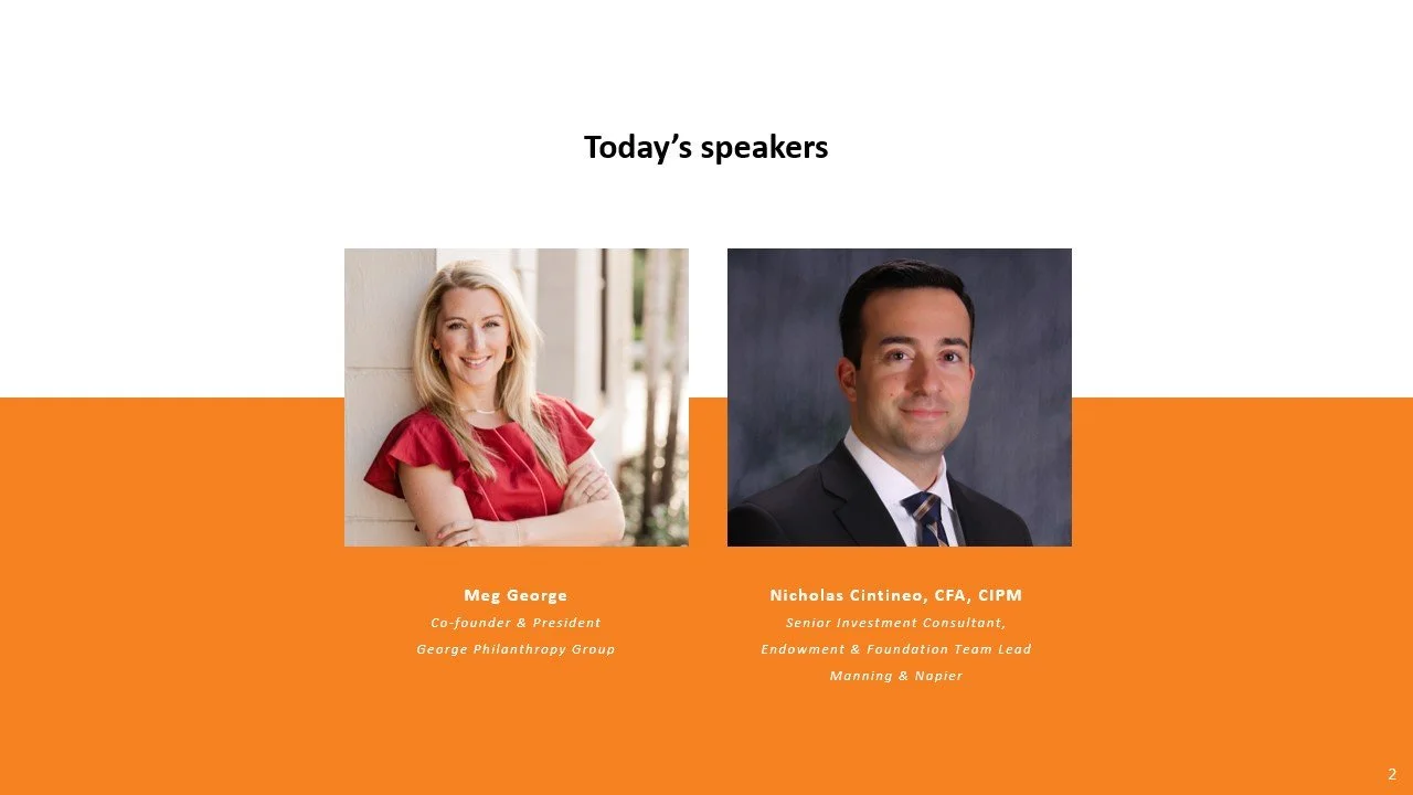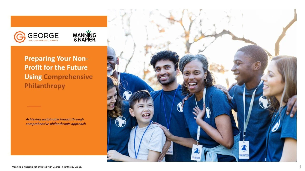 Meg, our President and Co-founder, spoke on Preparing your Nonprofit for the Future Using Comprehensive Philanthropy with Nick Cintineo from Manning & Napier (investment management) in November 2023.