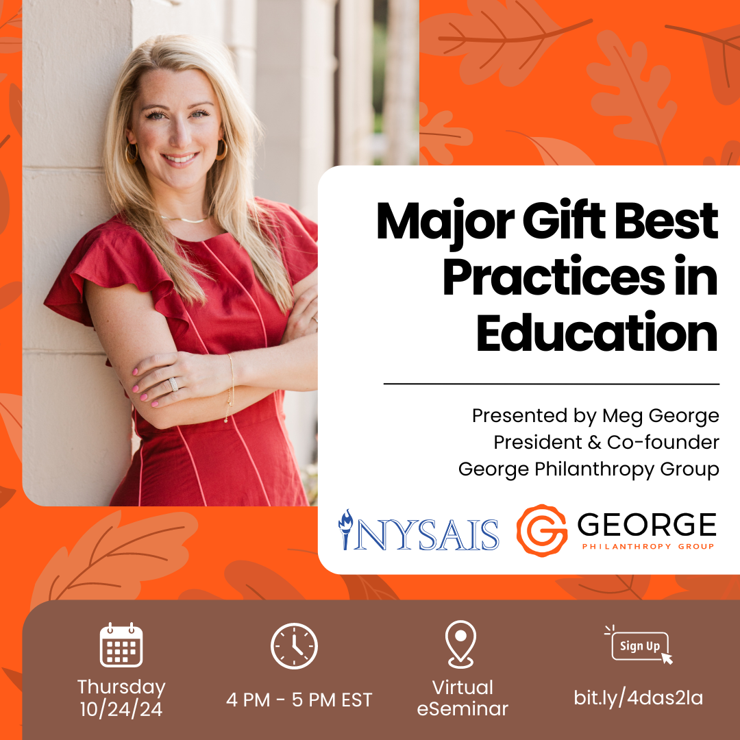 Meg George virtually presented at an eSeminar hosted by NYSAIS on major gift best practices in education.