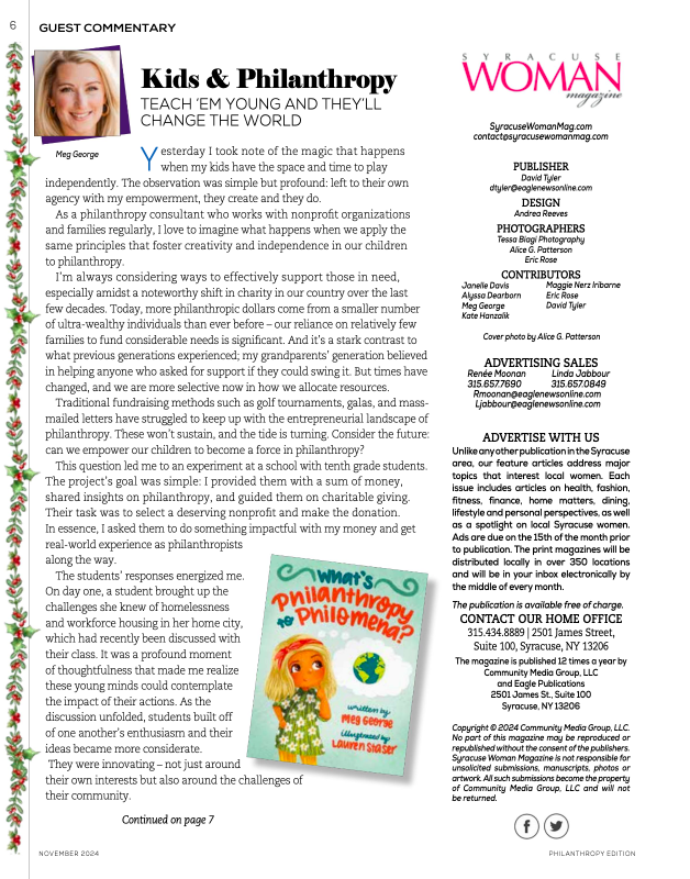 Our Co-founder and President, Meg George, was featured in the Philanthropy Edition of Syracuse Woman Magazine in November 2024. Click the button below to view the full magazine with Meg’s article on pages 6 and 7.