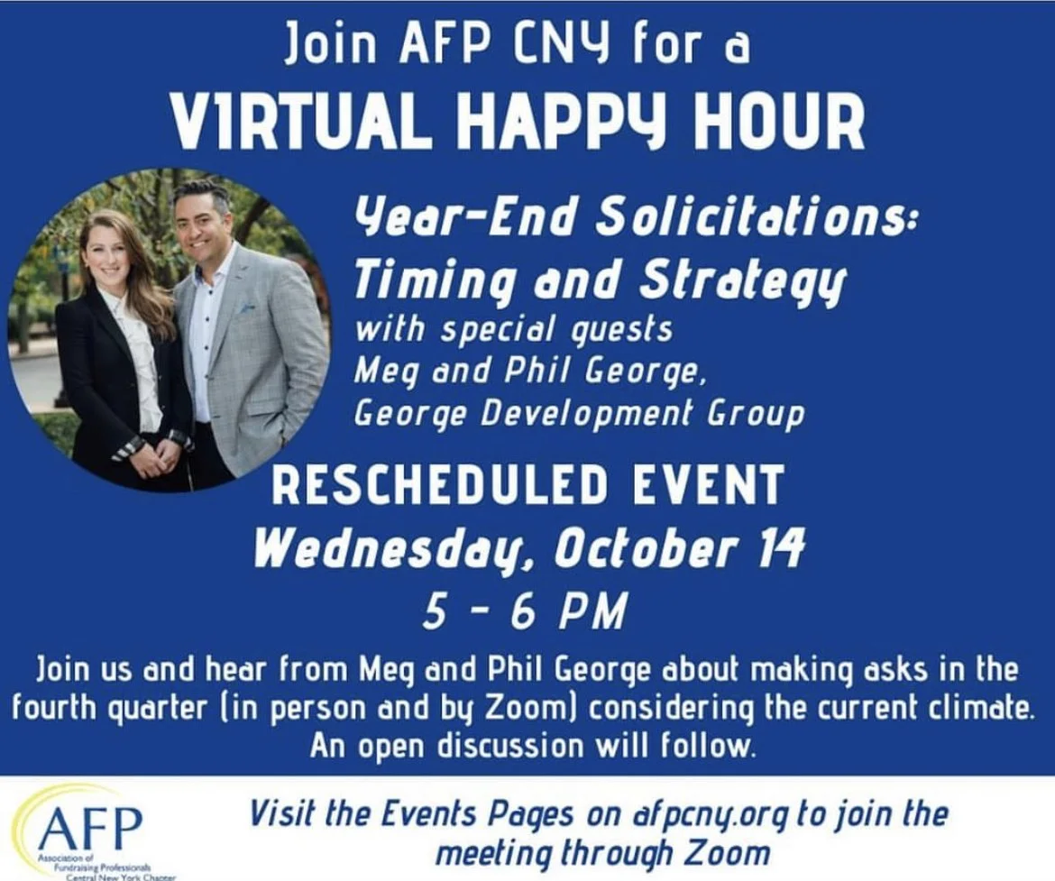 In October 2020, Meg and Phil George, our firm’s co-founders were special guests at the Association of Fundraising Professionals, Central New York chapter Virtual Happy Hour speaking on year-end solicitations, the timing and best strategies.